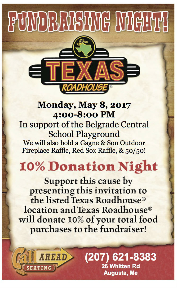 The Belgrade Central School PTO will be having a fundraising night at Texas Roadhouse in Augusta, Monday, May 8, from 4:00-8:00 PM. The proceeds go to benefit the Belgrade Central School Playground Fund