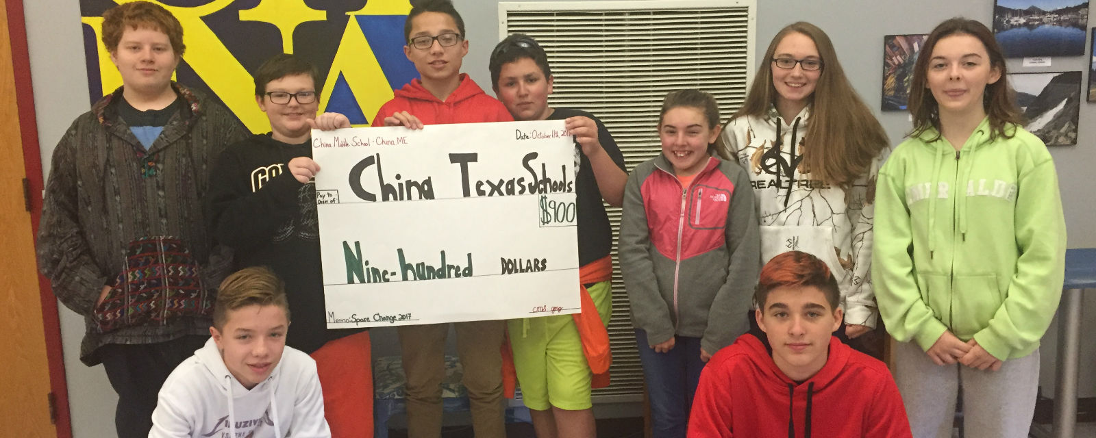 How are we helping people recover from Hurricane Harvey? When we realized there was a China Texas, which unfortunately was in the path of the storm, we felt it was a natural connection to help. The China Middle School JMG organized a spare change drive to help support the students and teachers in China, Texas as their middle school was destroyed by the flooding. The China Middle and Primary Schools stepped up big time, collecting over $500 in change and monetary donations. A combination of concession proceeds and staff jeans day money was also contributed. And then on the final day of change collection Calvin Mason, an 8th grader in JMG, was sorting and counting Box Tops. He proposed adding the $150 in Box Tops that his group had just processed to the change drive. Principal Ms. Bowden graciously accepted the proposal, which brought the grand total to $900.00. We always want to get involved with community projects whenever we can, whether that’s China Texas or China Maine. We look forward to hearing more inspiring stories in our district and communities!