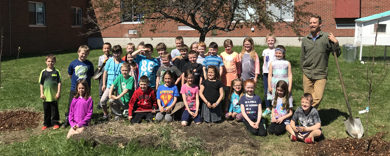 Atwood Primary was also the recipient of a ReTreeUs grant which resulted in 12 orchard trees being planted on campus on May 9th. We now have apple, pear, plum and peach trees! The orchard is growing nicely with buds for the children to see. We are watering the trees at least once a week.