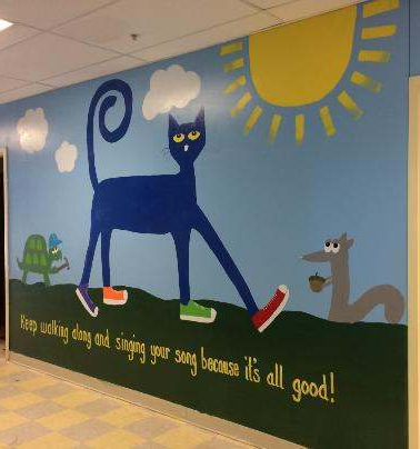 The James H Bean School has several new murals thanks to a very talented staff member. Thank you to Ms. Lorraine Bonczyk for coming in over the summer to paint these masterpieces for JHB students. The mural of “Pete the Cat” stands over 8 feet tall and 15 feet wide! Other paintings include pictures to get students attention and make them feel welcomed and cared for.