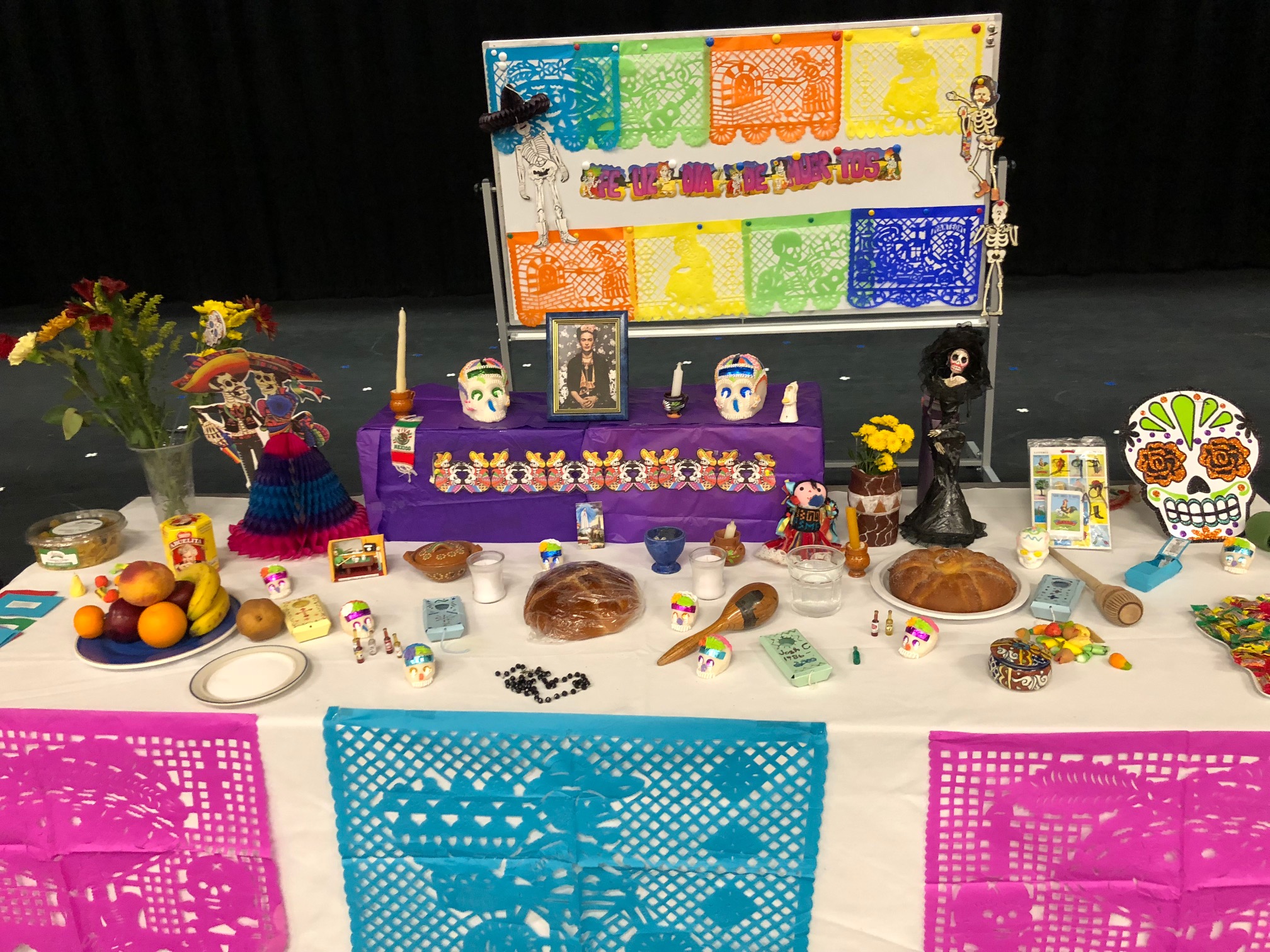 Each Spanish 3 student played a role in designing and building the Dia de los Muertos altar. The traditional altar decorations included sugar skulls, paper flowers, marigolds, candles, and traditional foods, all brought in or made by the class. Each student also chose a person to honor, whether it was a family or community member, or a famous Hispanic person.