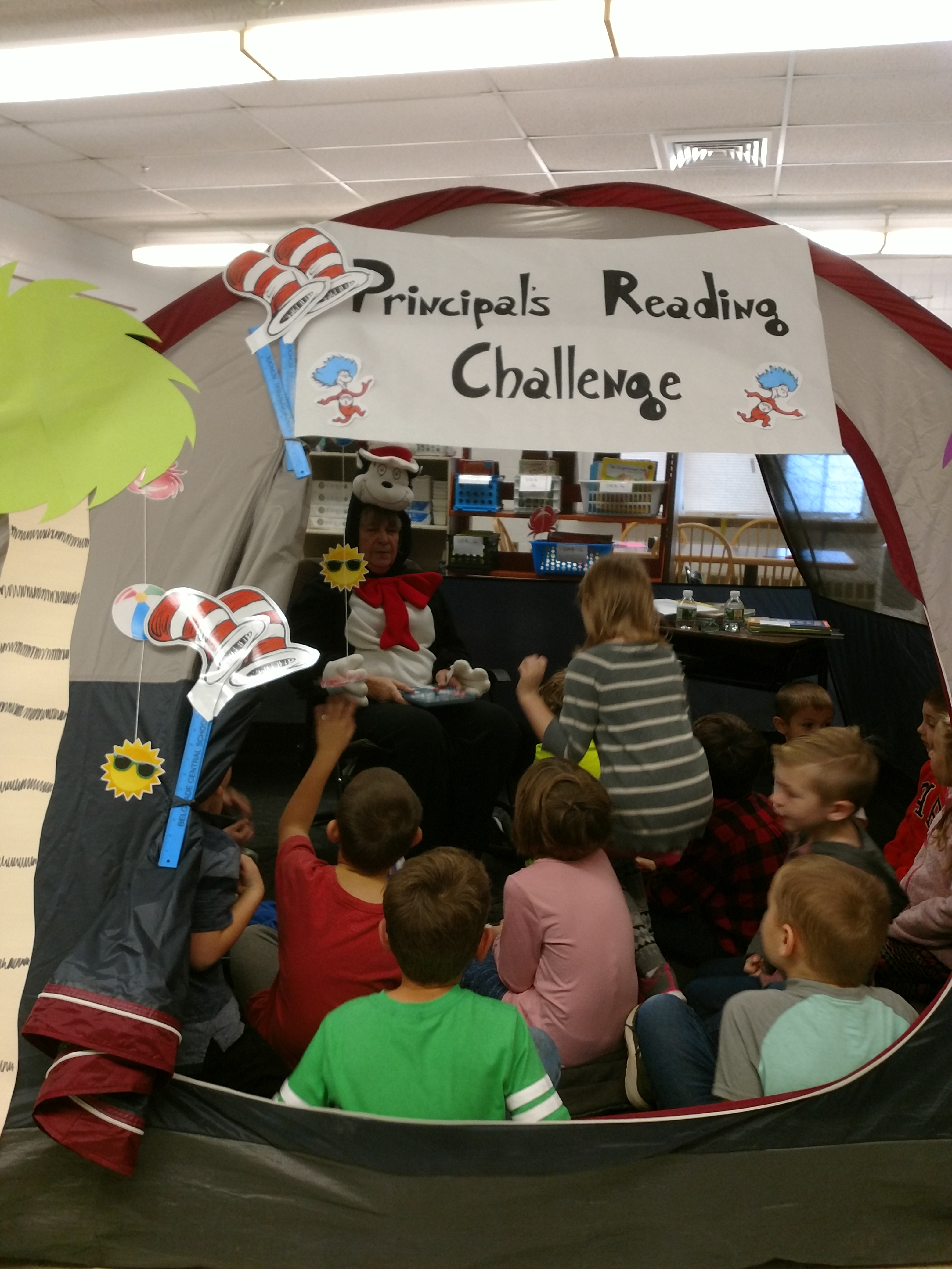 The Book It Principal challenge is an opportunity to spend a day dedicated to reading in all subject areas and potentially earn free books for the school’s library. BCS students spent the day doing a variety of reading centered activities. Classes brought in pillows and blankets, read about Math concepts, did fun reading activities that paired older readers with younger readers, and generally relaxed and enjoyed the written word throughout the day. The library had groups listening to online storybooks, and BCS principal Gwen Bacon had a tent set up where she spent the day reading to students.