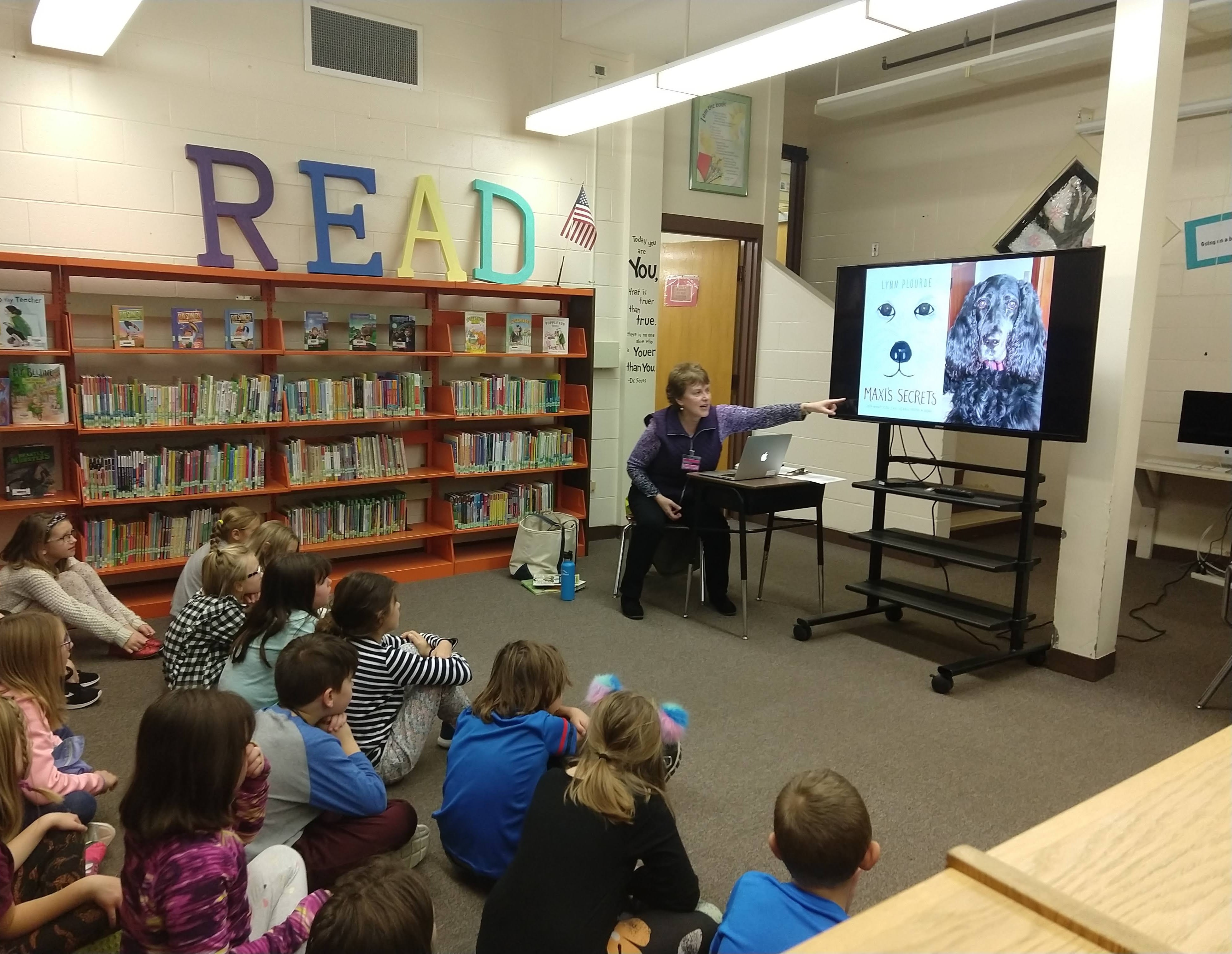 On November 1, 2018, Maine author Lynn Plourde came and presented to the students in grades 3-5 on her newest and only middle-grade novel Maxi’s Secrets. Students and staff alike were engaged in her interactive presentations as they listened to the author read from her book, participated in sign language activities, and were encouraged to broaden their view of the world with activities that challenged them to use senses other than sight. Six lucky recipients of the school’s Eagle and Student of the Month awards were invited down to the library to have a pizza lunch with Lynn. A good time was had by all.