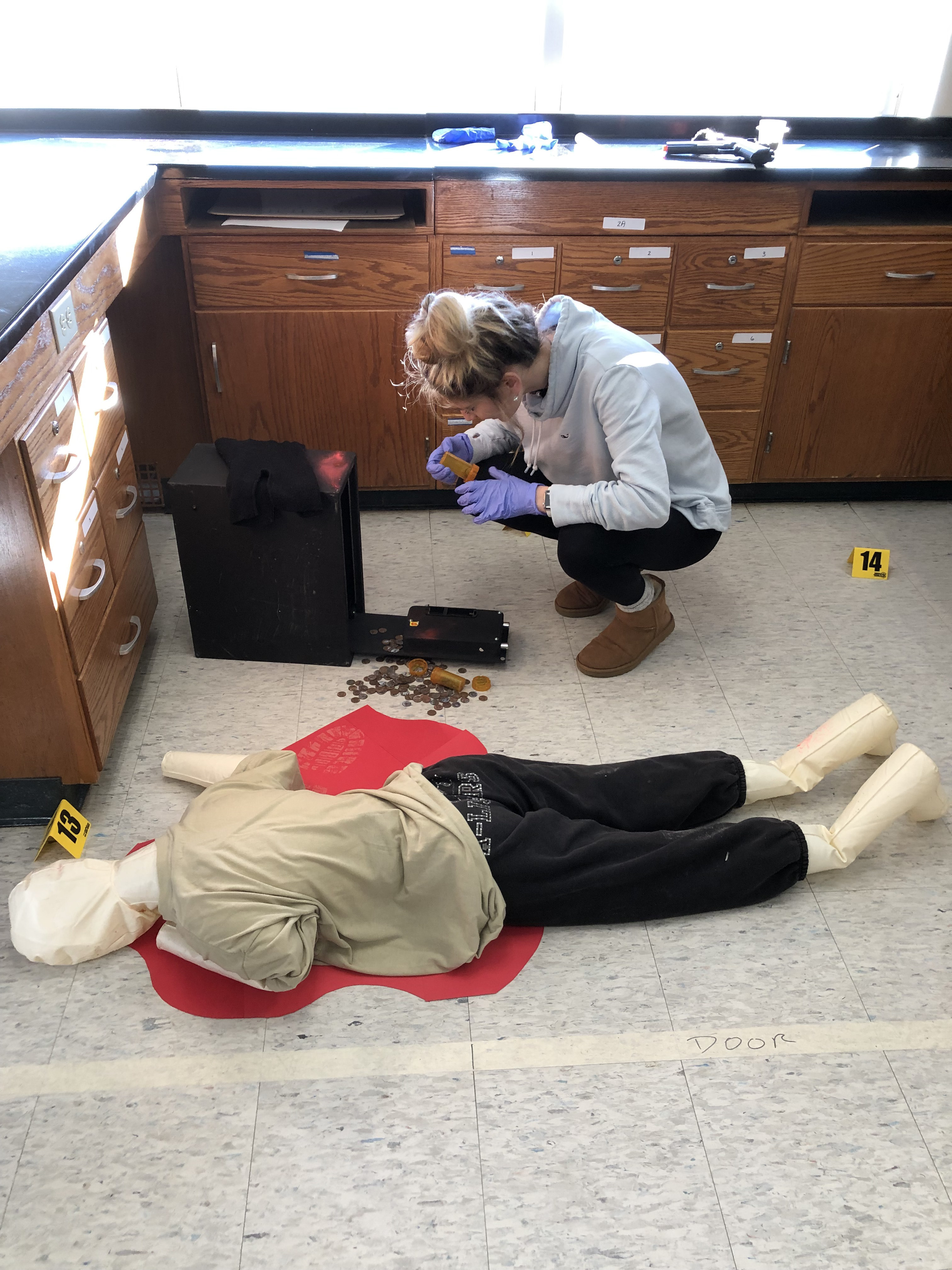 The first photos are of students in Mr. Burbank’s Forensic class analyzing a crime scene. The scenarios were very real looking and students were having fun analyzing the evidence and coming up with their own conclusions as to what transpired at the crime scene.