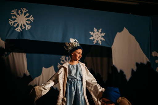 We had to practice a lot as we got used to our parts. My brother was a “Snow Chicken”. I was a “Hobgoblin”. The Hobgoblins were on stage almost all the time. We were part of the scene and helped to narrate the story. We were led by Hob (Justin) who was the director on stage. The Snow Chickens were mostly first and second graders. Some of the other parts were the Robbers, the Little Robber Girl, the Old Robber Woman, the Gardener Woman, the Lapish Woman, Kay and Gerda, Kay’s Grandmother, Gerda’s Grandmother, the Finish Woman, the Snow Animals, the Royalty, the Yeti, and of course the Snow Queen. We had rehearsal after auditions and on Wednesday and Thursday we had rehearsal too. Friday was our dress rehearsal. After dress rehearsal was our cast party! We got our Snow Queen shirts and had the cast sign them.