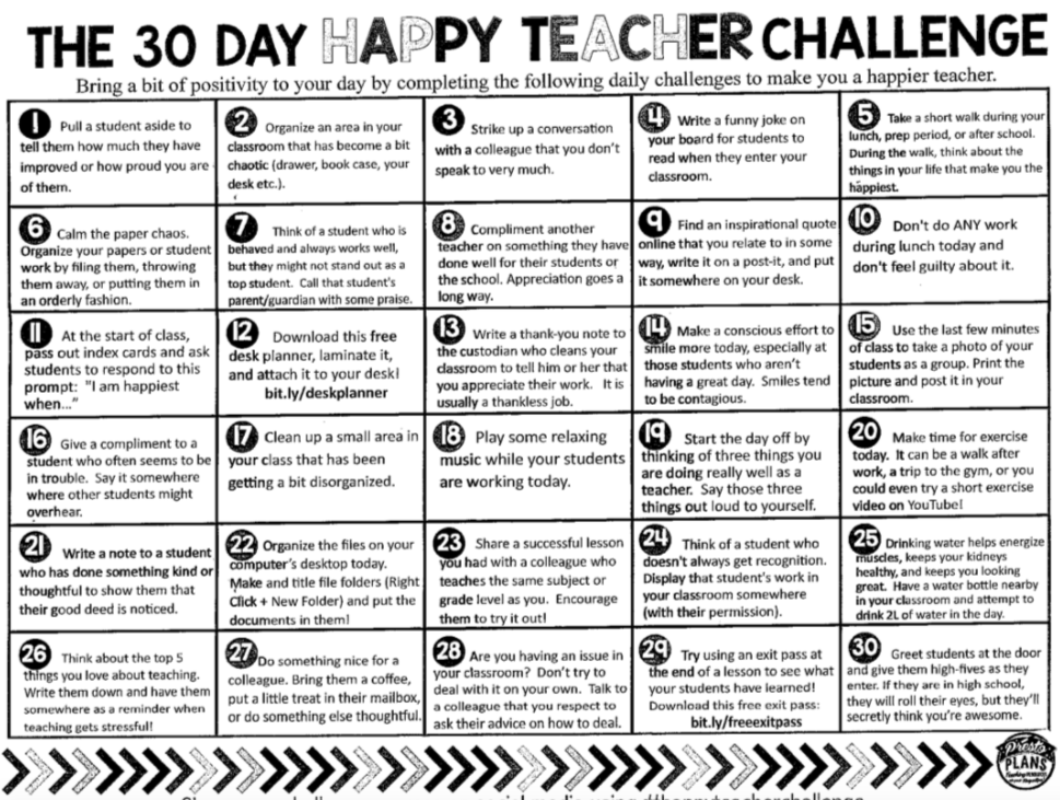 Principal Darlene Pietz handed out a new challenge to her staff on the second workshop day of the year. She wanted teachers to go into the year taking care of themselves and one another. The 30 Day Happy Teacher Challenge gives teachers daily tasks that range from having a work-free lunch without feeling guilty about it, to taking the time to chat with colleagues or acknowledge a student’s growth. Pietz challenged teachers to accomplish at least 80% of the items listed in order to be included in a prize drawing at the end of the month. The real motivator, however, is the impact the challenge can have for staff and students alike. “When you look at the items listed, you’ll see that a happy teacher is one who touches the lives of students in positive ways,” said Pietz.