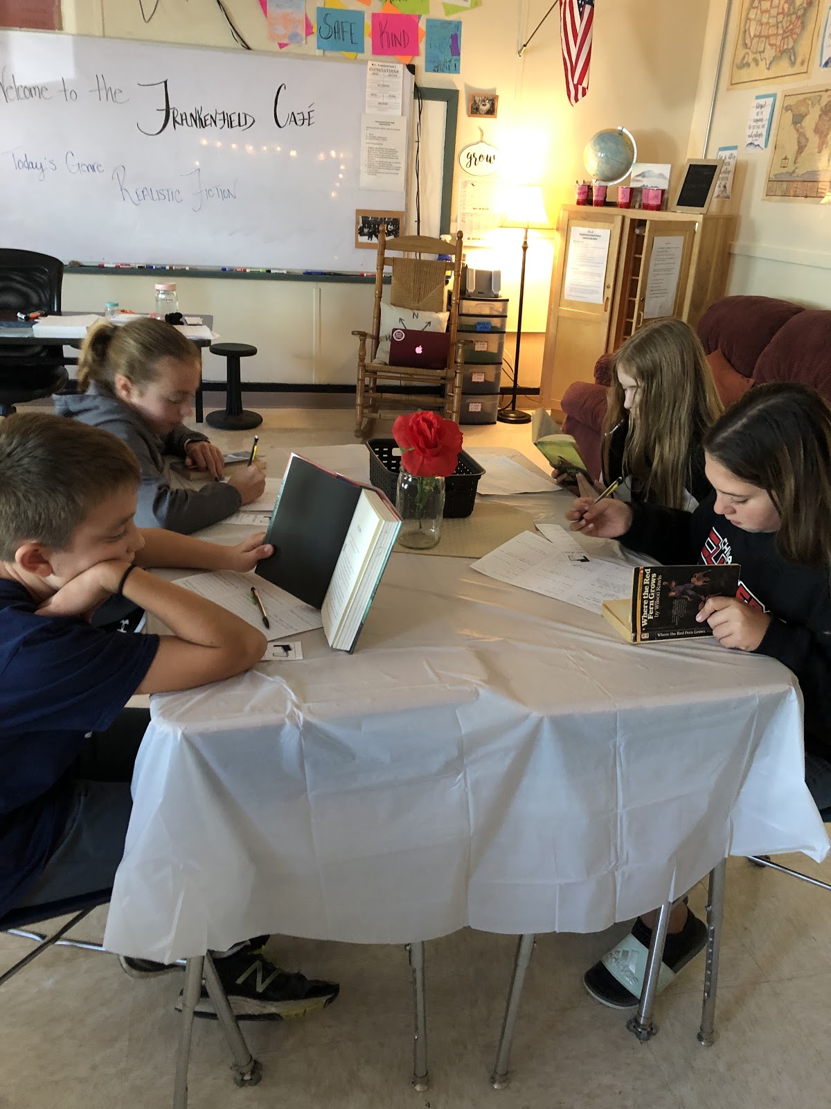At China Middle School, Mrs. Frankenfield’s 7th grade ELA class participated in a “book tasting” where they sampled realistic fiction novels that they may want to read. The classroom featured a cafe theme, complete with music, tablecloths, and flowers!