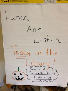 Lunchtime at JHB can be a lively and, at times, loud time of day as students busily chat and laugh at each other’s antics. In an effort to provide a quieter, calmer atmosphere, every Friday, students have the opportunity to eat their lunches in the library during our weekly “Lunch and Listen.” During this time, students eat while listening to a book read by Mrs. St. Peter. So far, students clamber at the opportunity to attend “Lunch and Listen.” Fourth grader, Ajah Cole, enjoys “Lunch and Listen” as she feels that “it is peaceful and it calms me down.” Fifth grader, Matthew Reardon, states “I enjoy listening to a story when eating my lunch.” Two of the most recent titles have been, The Jelly Donut Difference and What Makes A Hero.