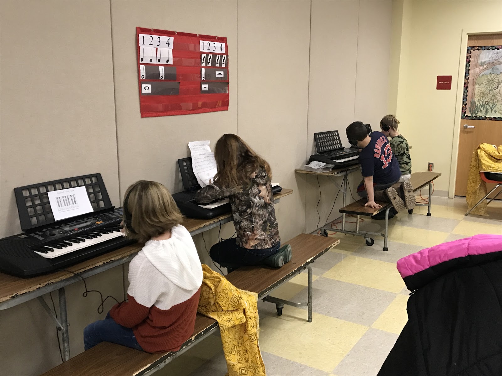Fifth-grade students at the James Bean School have been given the opportunity to extend their classroom learning of the keyboards. Mrs. Paradis has opened up the music room to students from 2:30-3:00pm to work on music from their self-paced binder of songs. There have been anywhere from a handful to a roomful of students on any given day. These students have also been teaching each other songs of their choosing, such as Beethoven’s ‘Fur Elise’ and The Addams Family Theme song. Mrs. Paradis is happy to have such self-motivated students!