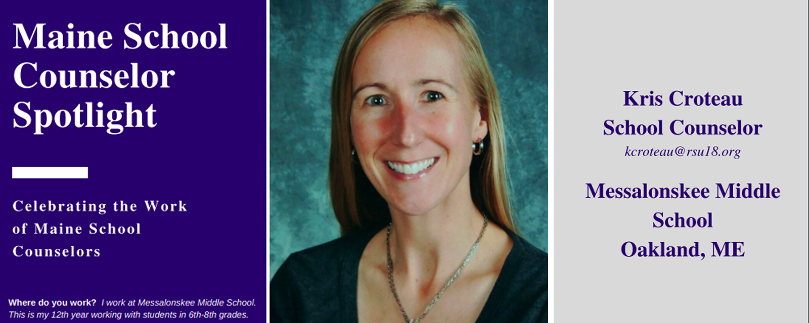 Messalonskee Middle School Counselor Kris Croteau was highlighted in the December MESCA Maine School Counselor Spotlight. This is a well-deserved recognition of someone who does so much in our RSU 18 community. Congratulations, Kris!
