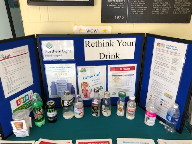 Did you know that there are 35 teaspoons of sugar in a coffee coolatta? Atwood Primary School has had a “Rethink your Drink” display up in the school foyer all week. Set up by Jim Fortunato, the Northern Kennebec County Coordinator from Let’s Go, the display is to help students and parents understand how much sugar is actually in the beverages that they consume. Check out the full display at Atwood.