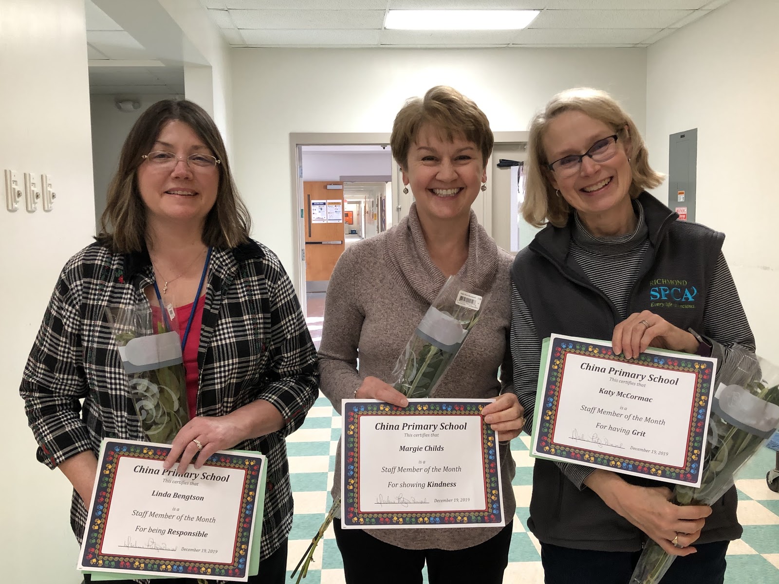 Each month at China Primary students from every classroom are chosen by their teacher to receive a student of the month award. There are three different awards to be given, one for a student who shows kindness, one for students who try their best or show “grit” and an award for being responsible. The recipients receive their award during a monthly assembly and are recognized for being role models in each of these areas. In addition to students, staff members who exemplify these behaviors are presented with an award and applauded by students and staff.