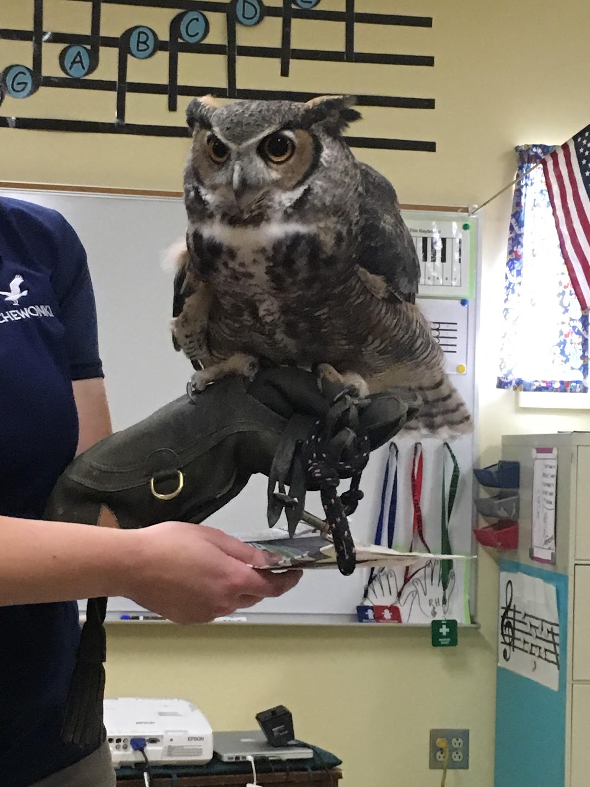 The Kindergartners at James H. Bean were able to participate in Chewonki’s Owls of Maine Traveling Exhibit. Three live owls are the highlights of this program which introduced our students to the owls native to Maine and New England. The presentation begins with slides and sounds of different types of owls. Students learn the identifying characteristics and calls of each owl, then, using talons, wings, and skulls, we explore the adaptations of these silent nocturnal hunters. This program ends with being able to see three live owls. We appreciate all the families at JHB that bring in Box Tops for Education because this is what funded the program.