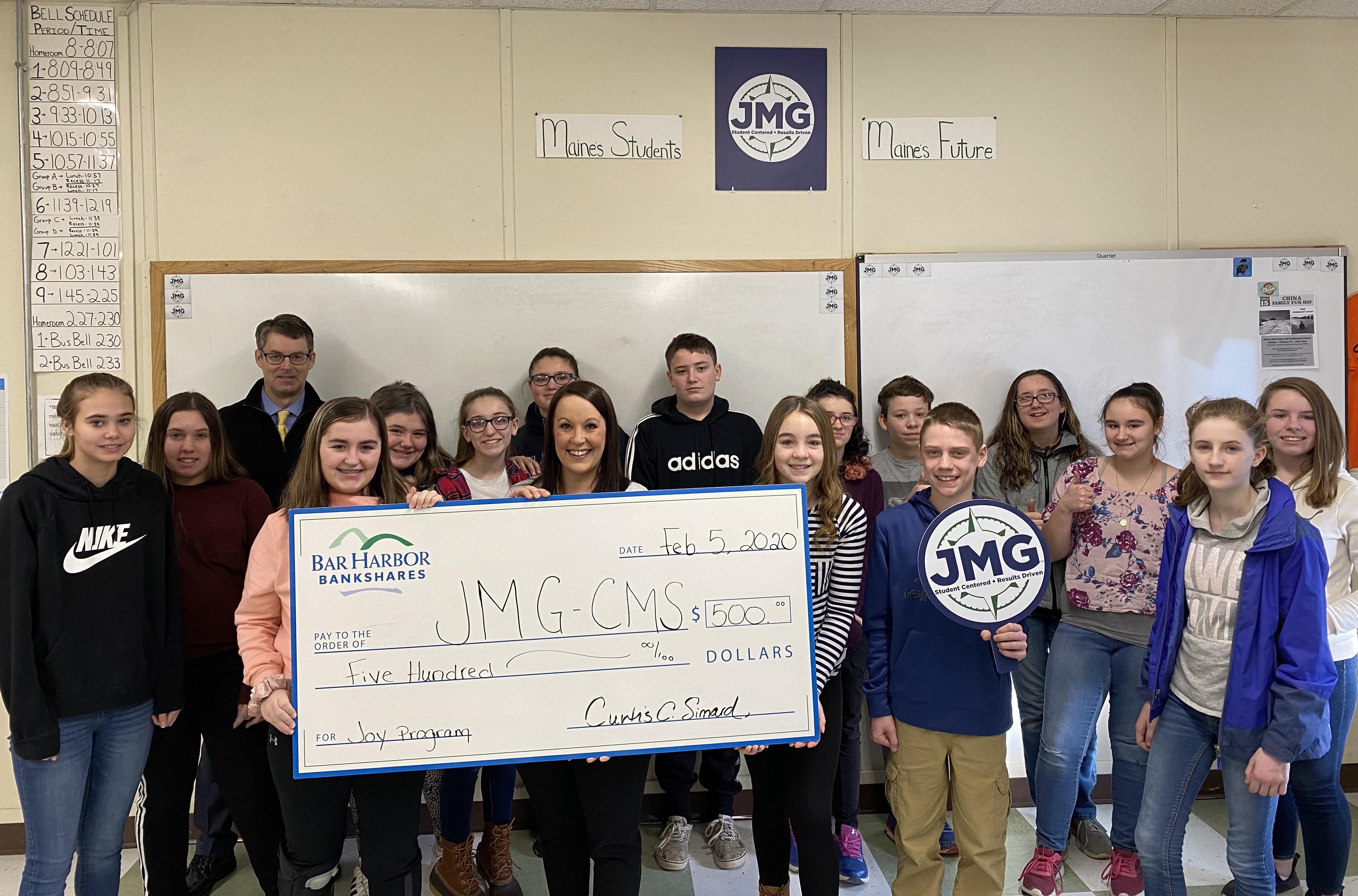 China Middle School JMG and Bar Harbor Bank and Trust continue to strengthen their partnership. JMG was awarded a $500 Community Grant as seed funding for an empathy project, where students will learn the importance of philanthropy and community service.