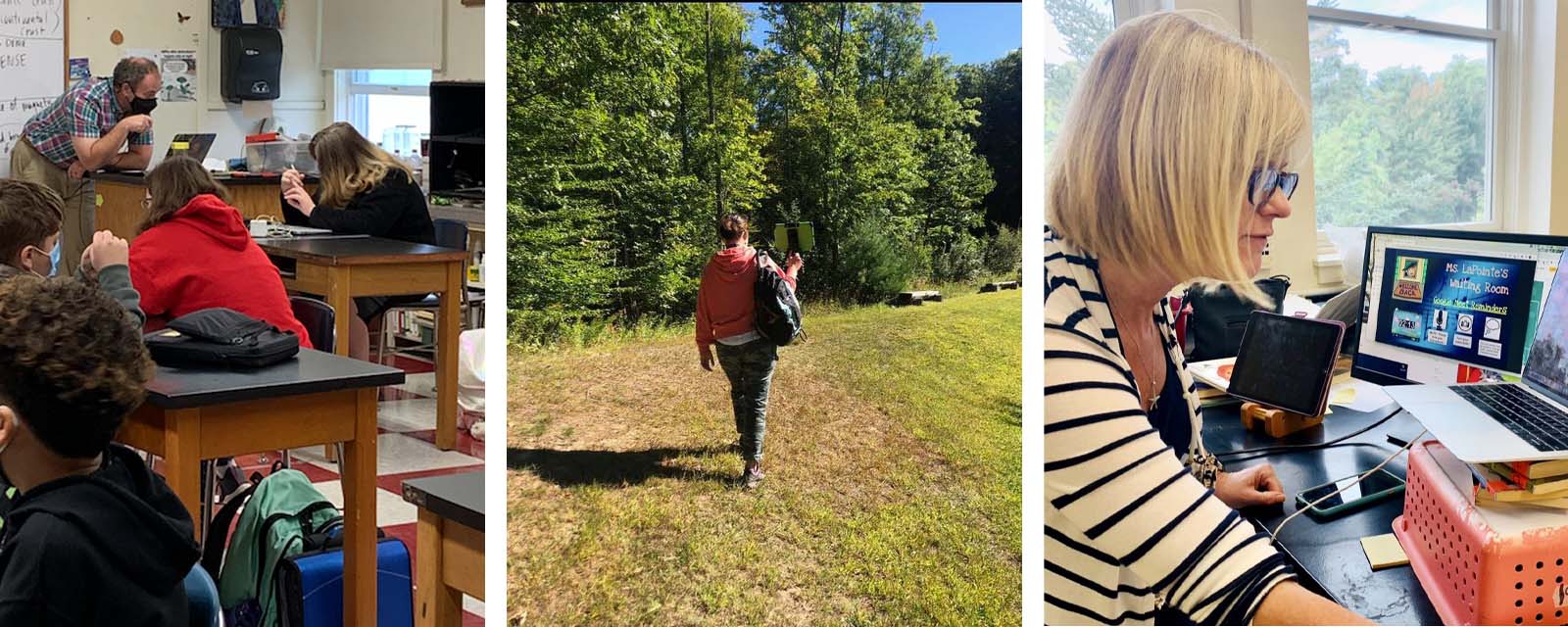 Upper-level teachers are also working hard to find ways for remote students to still be able to interact with students working in class. MMS Math teacher Martha Farnham sets up Jeopardy reviews with teams that are a mix of remote and in-person students. MMS Science teacher Amanda Ripa recently juggled an iPad and a hot spot to take her remote students outside with her in-person class for a lesson. “It was very rewarding to see the outcome,” said Ripa. “ It’s a bit of a circus but I’m getting used to it and not letting it limit my teaching.”
