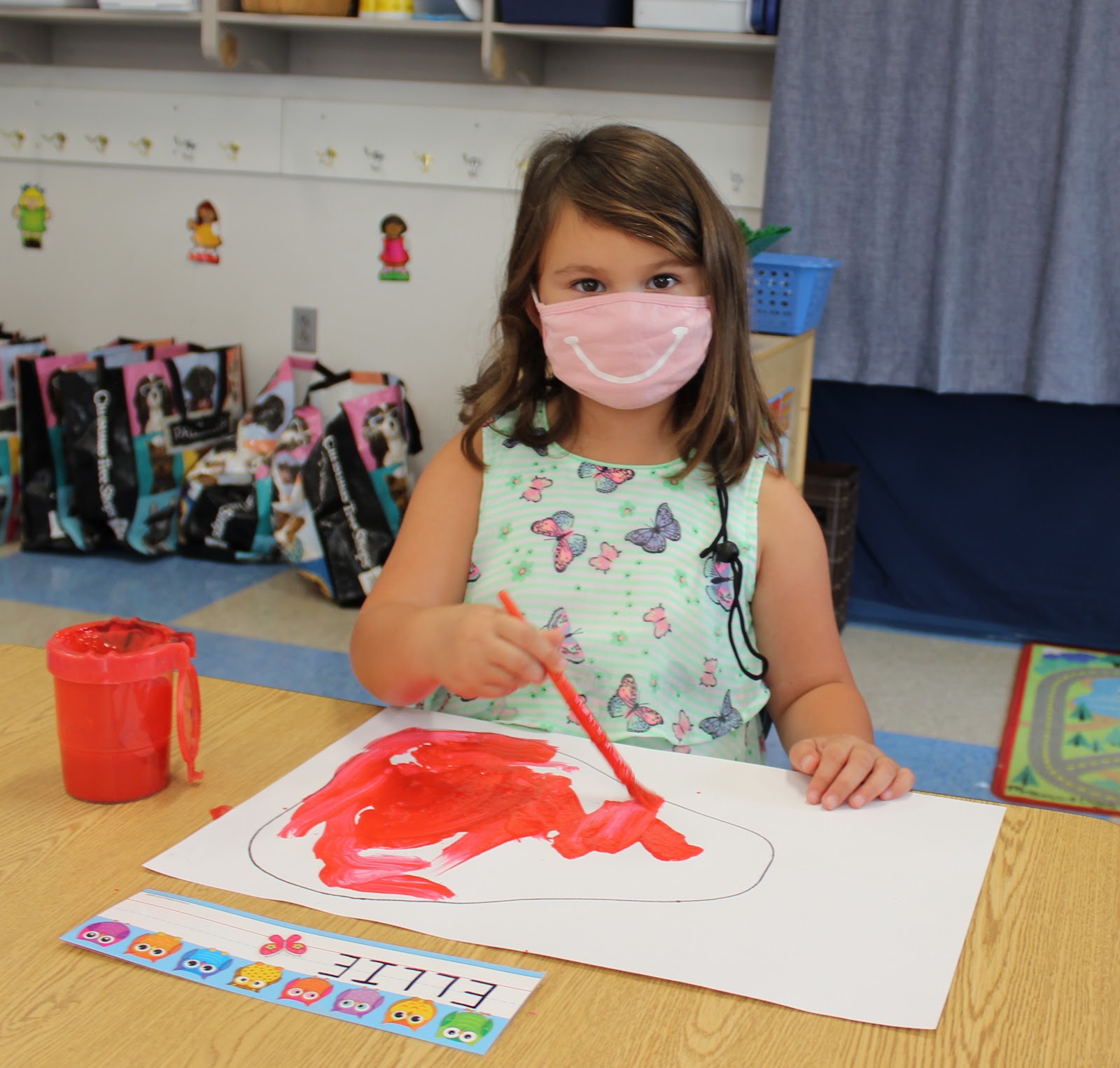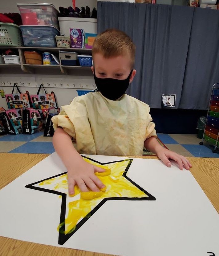 Masks, social distancing, and health protocols haven’t kept children in Miss Robie’s Pre-K class from exploring tempera paint, finger paint, and white glue! Students painted their own strawberries with scented paint after reading the book, The Little Mouse, The Red Ripe Strawberry, and the Big Hungry Bear by Don and Audrey Wood. They also explored fingerpainting yellow stars and gluing their own bedazzled wands!