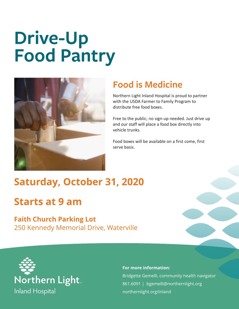 - Drive-Up Food Pantry at Faith Church Parking Lot: On Saturday, October 31, Northern Light Inland Hospital is partnering with the USDA Farmer to Family program to distribute FREE food boxes, beginning at 9:00 am and running until available boxes are distributed.