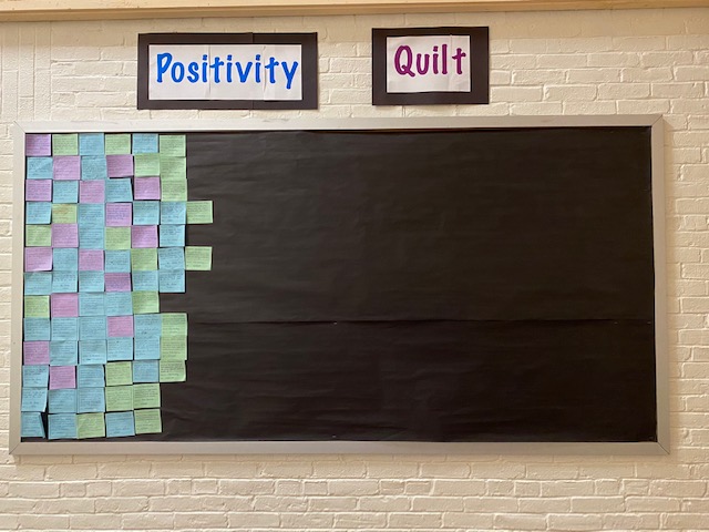 On November 6, Principal Melanie Smith challenged the Williams Elementary Staff to make 275+ positive phone calls in 6 weeks. Each positive call is represented by a square on the positivity quilt that includes the name of the student and the positive news shared with the family. Each grade level uses different colored squares.