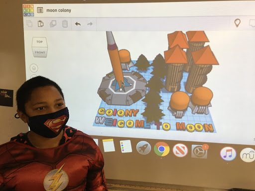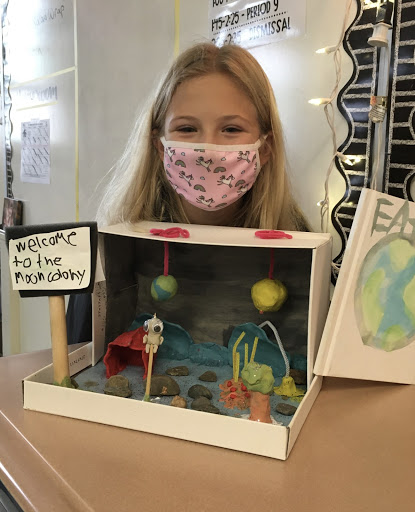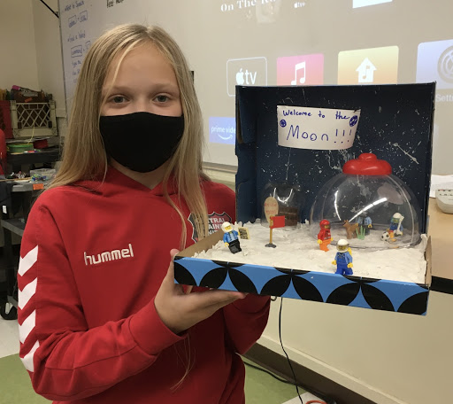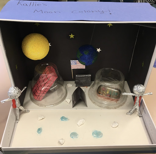 Fifth grade students in Mrs. Averill’s science class and Ms. Chamberlain’s ELA class completed an interdisciplinary project in which they examined motivations for building a colony on the Moon, identified problems to human survival on the Moon, and developed solutions to these problems by designing a Moon colony.