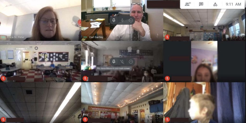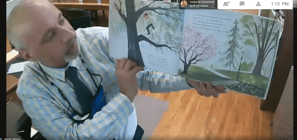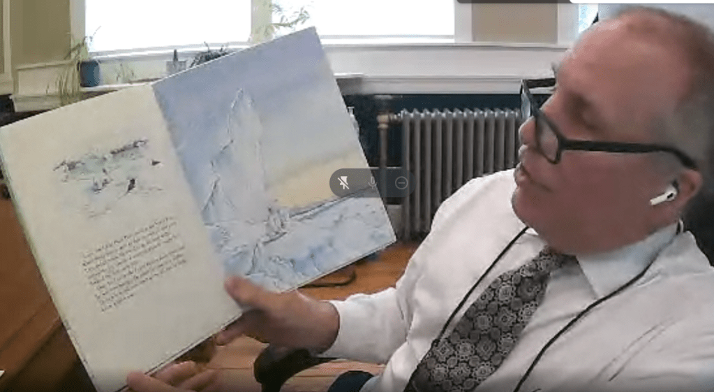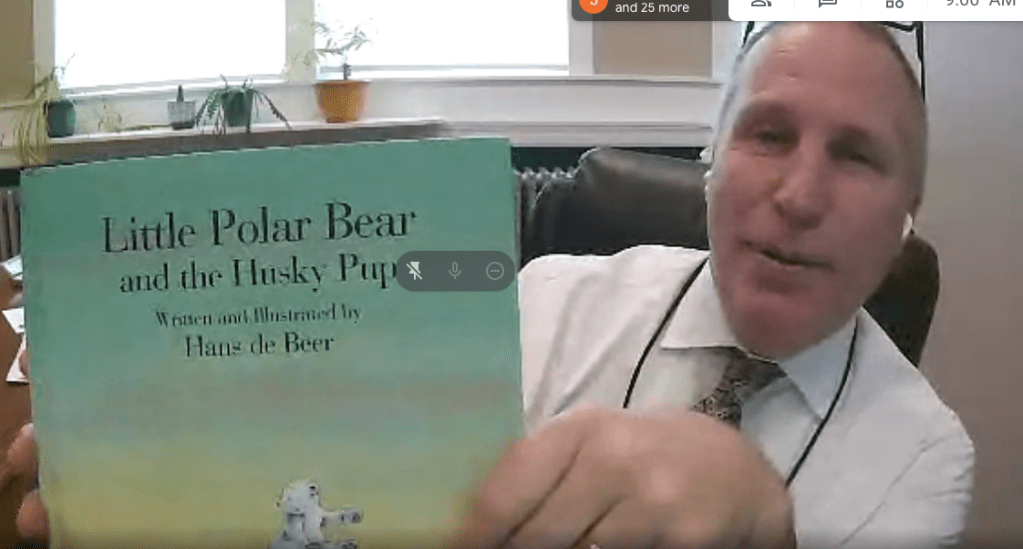 JHB students and staff were joined virtually by two special guest readers; Superintendent Carl Gartley and Assistant Superintendent Keith Morin both hopped on Google Meet to read specially chosen books to classrooms and remote students. Mr. Gartley read Little Polar Bear and the Husky Pup by Hans de Beer in the morning and Mr. Morin read Up in the Leaves by Shira Boss after lunch. Mr. Gartley and Mr. Morin both took the time to share how their chosen stories connected to their own lives, and why reading was important to them.