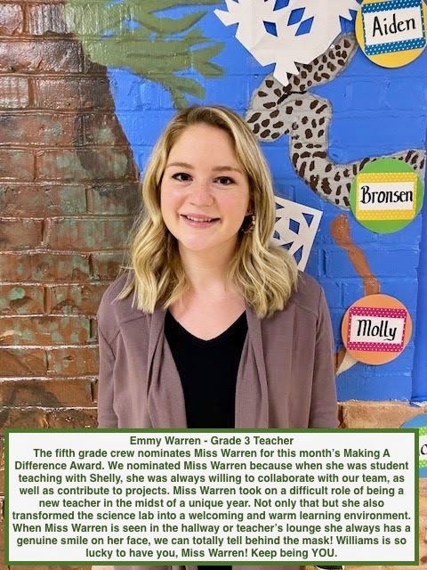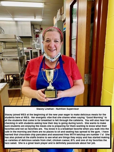Stacey Linehan, Nutrition Supervisor and Emmy Warren, 3rd grade teacher were recently recognized for all they do for our students. Congratulations to you both!