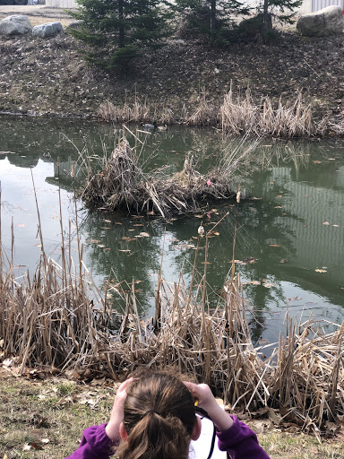 In 2018, our team installed two artificial floating islands in our pond to increase biodiversity and help to clean the water. The islands are made of mesh material with native plants growing on top and through the island. We planted cattail, swamp milkweed, New England aster, arrowhead, and more. What was noteworthy about our observation of the Mallards is that at one point during the day, the ducks were “nesting” up on the floating island! We wonder if the ducks will nest on our islands among the tall cattails and milkweed; it would be a great habitat. When we approached the ducks, they hopped off into the water and swam around the pond.
