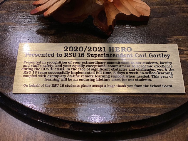 Presented in recognition of your extraordinary commitment to our students, faculty, and staff’s safety, and your equally exceptional commitment to academic excellence during the COVID crisis. In the face of significant obstacles and challenges, you and the RSU 18 team successfully implemented full time, 5 days a week, in-school learning coupled with exemplary on-line remote learning support when needed. This year of learning will be an enduring lifetime asset for our students.