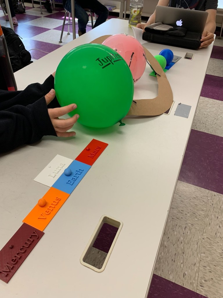 Mr. Schmidt’s 7th and 8th grade classes ended their year by creating a scale model of the solar system. After learning scientific notation and volume and surface area of spheres, we calculated all of the values we needed. The 3D printers at CMS were used to build the actual planets except for Jupiter and Saturn. The students were amazed to see exactly why we don’t usually draw models of the solar system to scale. Eventually we took the planets outside into the school forest. We couldn’t reach them all because Pluto ended up being over five miles away from our two meter Sun!