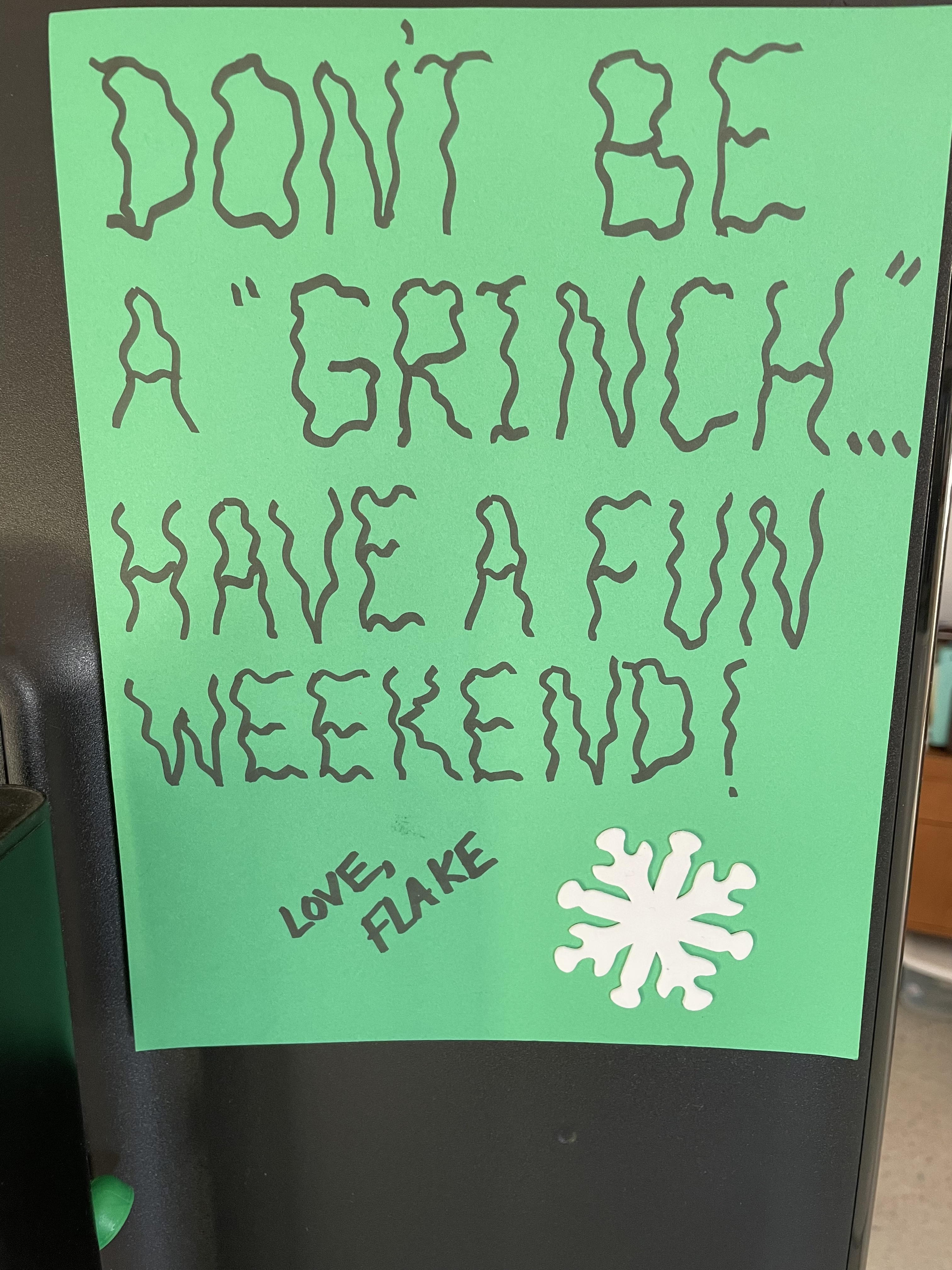 It’s Atwood’s first Falalala Friday of December and check out this morning’s festive greeters – Jessica Hartley, Danielle Boutin, and Amy Grenier! Even Atwood’s elf got into “Grinch Day” for Falalala Friday! #WeAreRSU18 #AtwoodAwesome