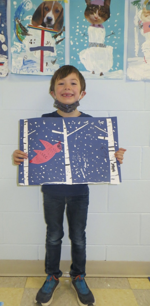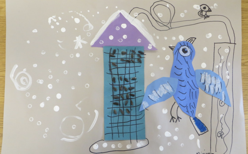 Atwood Awesome artists have been working on art inspired by snow, ice, and cold. In kindergarten art, they read Snowballs by Lois Elhert and created snow cat or snow dog collages. Students are currently being introduced to a variety of art mediums. They had an opportunity to print with sponges, cut shapes with scissors, and add quality details with oil pastels. They used Q-tips to paint snow falling lightly and some chose to create a blizzard of snow. Kindergarten students also created bird feeders in the snow and learned about goldfinches, blue jays, and cardinals (while reviewing the primary colors). Those three birds stay for the winter just like us!