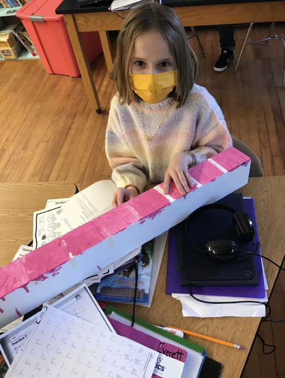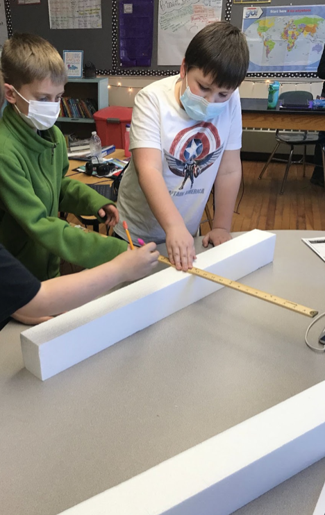 Mrs. Lachance’s fourth graders from Belgrade Central used styrofoam blocks that she grabbed from her husband’s work (shoutout to E. Carrier Shelving in Sidney) to build a life-size fraction bar tower! Students had to measure and divide to find the length of the equal parts! They taped them off then got out their paintbrushes! These mathematicians have used the tower throughout their fractions unit to help order and compare fractions with unlike denominators.