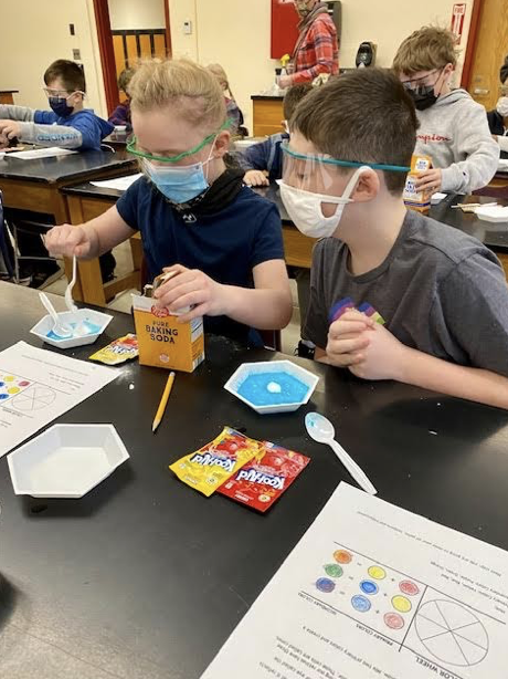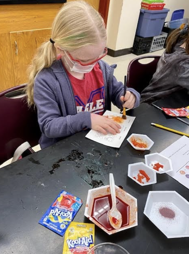 Colby professors, Lisa Miller and Julie Millard along with Colby students Josh Goldman and Olchey Tchavyntchak visited Williams Elementary on January 12 and 25 to conduct Kool-Aid Chemistry experiments with the fourth graders! First, students reviewed the color wheel and also discussed primary and secondary colors. Students created the color base and added linseed oil, gum arabic, and egg yolk to see which paint was the clumpiest, smoothest, and most glossy. By the end of the lesson, students discovered that they created their own oil, tempera, and watercolor paints! Students greatly enjoyed this hands on activity and were also happy to hear that they could keep their special safety glasses that the Colby teachers provided prior to the experiment.