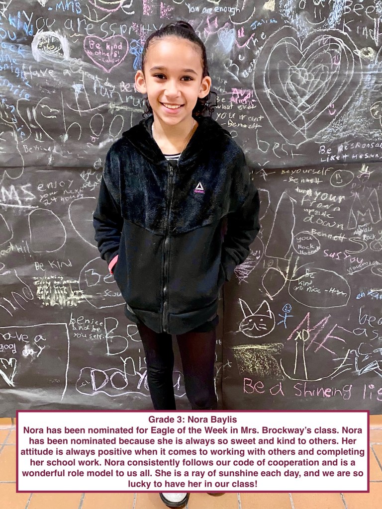 Nora has been nominated for Eagle of the Week in Mrs. Brockway’s class. Nora has been nominated because she is always so sweet and kind to others. Her attitude is always positive when it comes to working with others and completing her school work. Nora consistently follows our code of cooperation and is a wonderful role model to us all. She is a ray of sunshine each day, and we are so lucky to have her in our class!