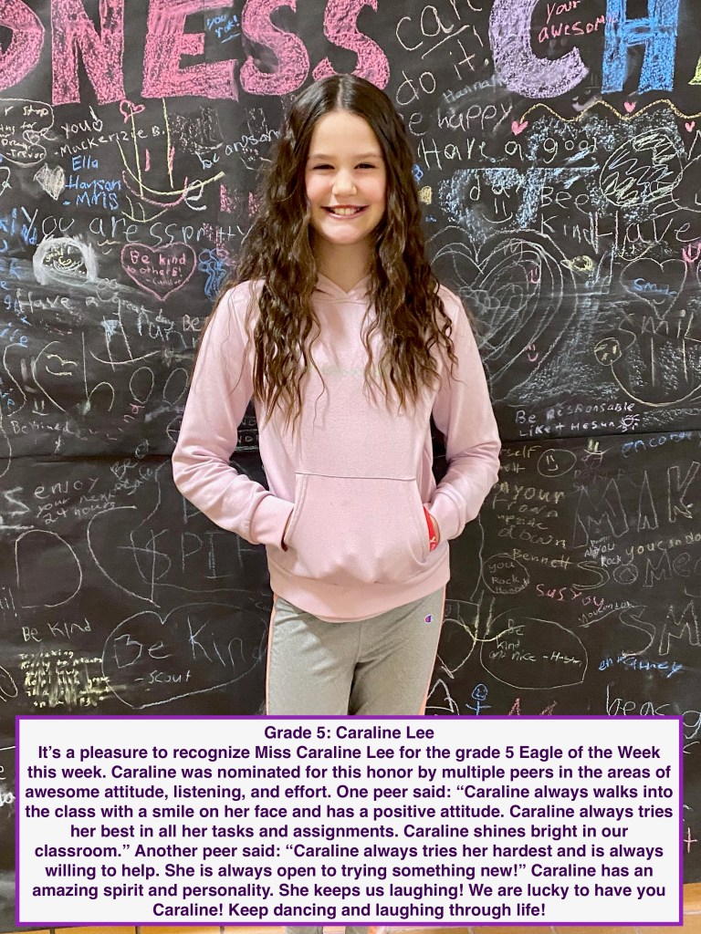It’s a pleasure to recognize Miss Caraline Lee for the grade 5 Eagle of the Week this week. Caraline was nominated for this honor by multiple peers in the areas of awesome attitude, listening, and effort. One peer said, “Caraline always walks into the class with a smile on her face and has a positive attitude. Caraline always tries her best in all her tasks and assignments. Caraline shines bright in our classroom.” Another peer said, “Caraline always tries her hardest and is always willing to help. She is always open to try something new!” Caraline has an amazing spirit and personality. She keeps us laughing! We are luck to have you, Caraline! Keep dancing and laughing through life!